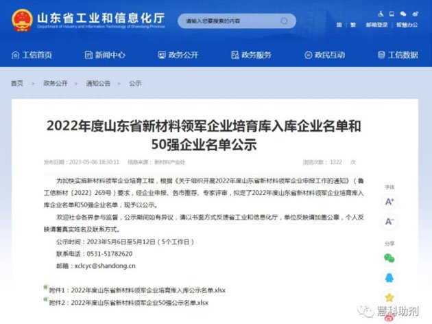 公司入選2022年度山東省新材料領軍培育庫入庫企業名單